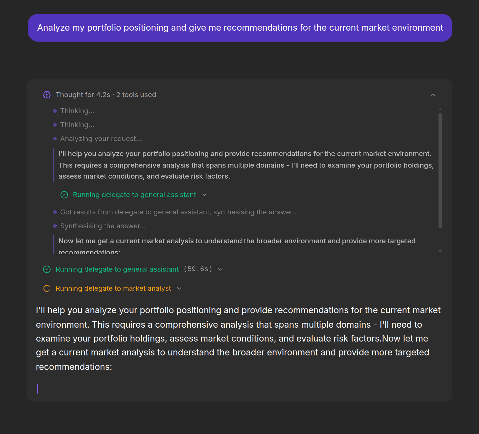 125 specialized tools spanning market data, fundamentals, SEC filings, factor scoring, portfolio analysis, and trade execution. Simple queries resolve directly. Complex multi-domain analysis delegates to specialist subagents. Every step is visible through real-time event streaming.